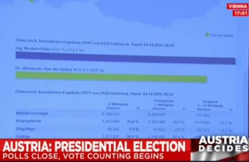 17.01 Uhr Ortszeit bringt EURO-NEWS die aktuelle Hochrechnung zur Präsidentenwahl: Hofer liegt mit 53% klar vor Bellen mit 46%.